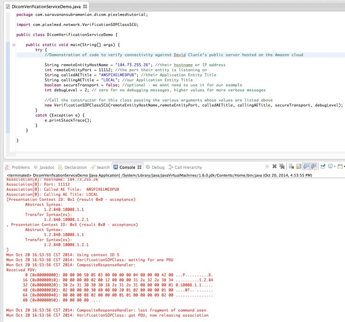 If you are running a Mac like me, you can download software such as OsiriX (available for purchase here). On the other hand, if you are running a Windows OS, something such as ClearCanvas Open Source Community Edition should do (available for download here). if you don’t want to install any applications at all, there are also some public servers available. David Clunie set up something on the Amazon cloud. The IP address of the DICOM entity is 184.73.255.26, the port is 11112 and the AET is AWSPIXELMEDPUB. Although I have tried communicating with this entity, and it responded to my verification request successfully, I am not 100% sure about its up time or availability during the day. I gleaned details of this entity based on a discussion on the web here. So, please contact him directly if you have any questions. For now, let us proceed to look at how we would implement the DICOM verification SCU functionality using the PixelMed toolkit.The other option is to try another public server hosted by Dave Harvey here.